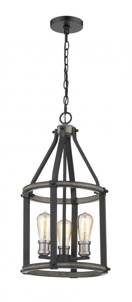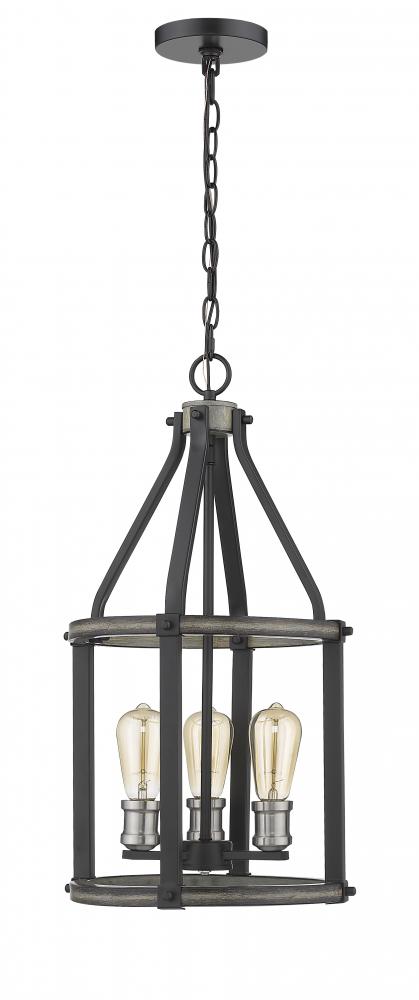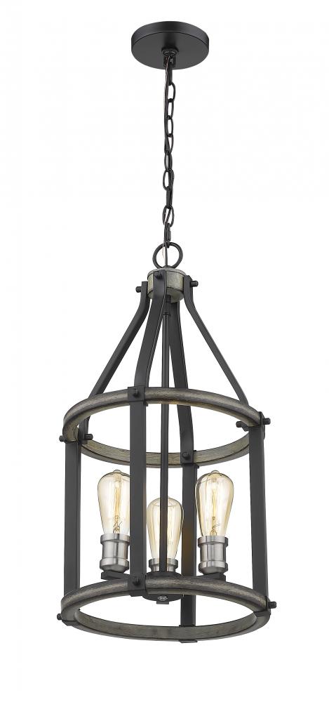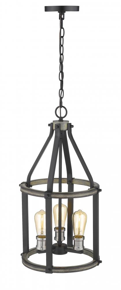 Stunning in an entryway, this three-light faux barnwood pendant looks beautiful when paired with a modern motif. The open cage-inspired silhouette highlights exposed lightbulbs in an ashen finish.