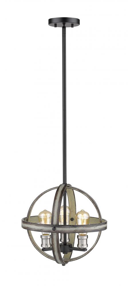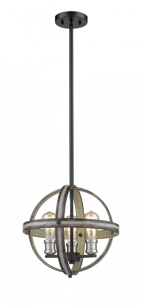 Make a modern statement with the interesting, open shape of this three-light pendant light. The open cage-like silhouette features a spherical frame and exposed lightbulbs in faux ashen barnwood.