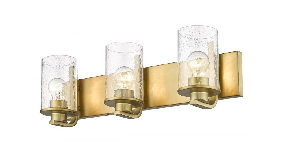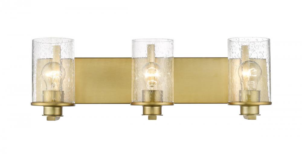 Light up a modern or transitional bath space with this elegant three-light vanity light from the Beckett collection. Showcasing a hint of village nautical fare, its romantic clear seedy glass cylinder shades offer a heady effect. A rectangular steel mount and accents fashioned of warm olde brass finish steel deliver a tasteful aesthetic.