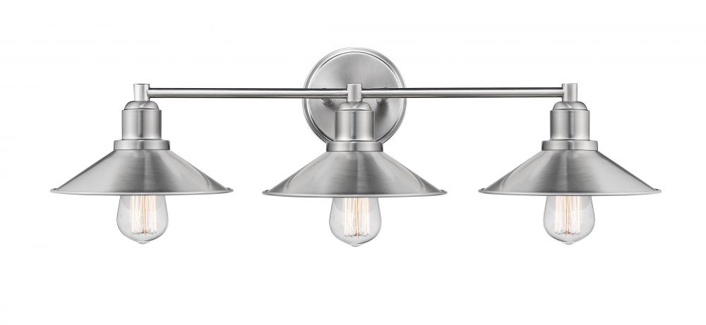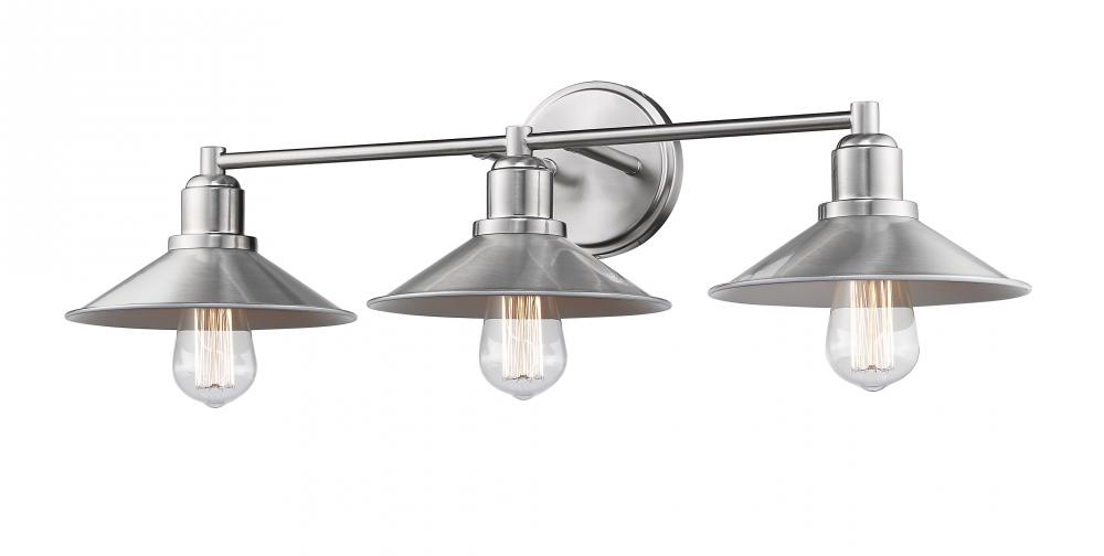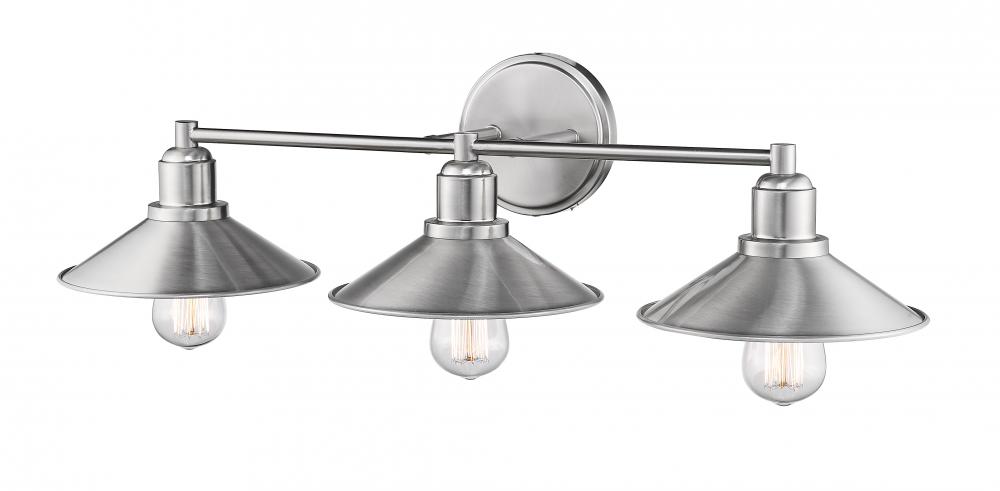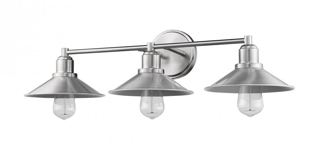 Call attention to a custom designed bath sink with this three-light vanity fixture. Sleek brushed nickel finish steel offers an authentic charm to a trio of hood shades and sweet vintage bulbs that infuse character.