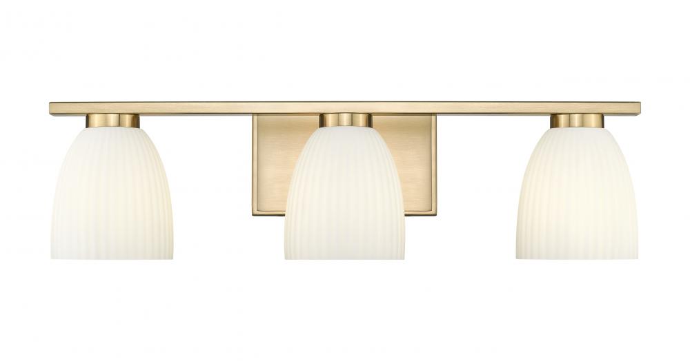 A modern gold finish brings warmth and polish to this three-light vanity fixture, pairing beautifully with the soft glow of matte opal glass. Ribbed shades add delicate texture, diffusing light into a subtle, flattering wash. It?s an elegant addition that elevates any morning routine.