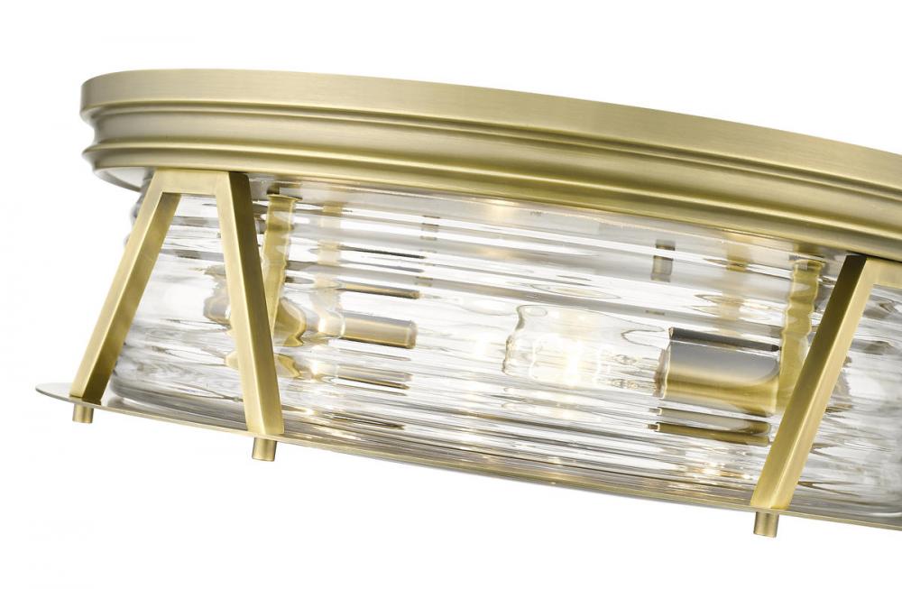 Delivering bright lighting for a modern space, this brass and glass four-light flushmount ceiling light covers all design bases with a nautical-inspired motif serving industrial, modern, and Art Deco aesthetics. Emulating a Fresnel lens found in historic lighthouses on coastal North American shores, this light from the Cape Harbor collection blends chic ribbed glass with warm rubbed brass finish steel to create versatility and an expressive look in any contemporary or transitional space.