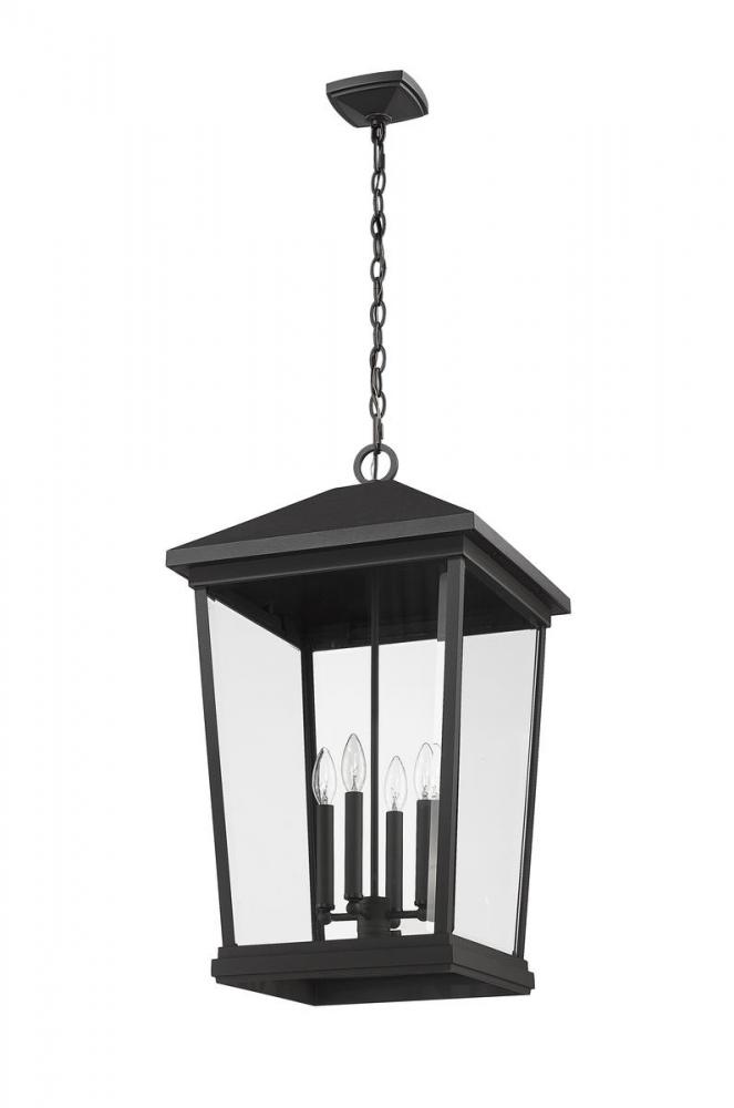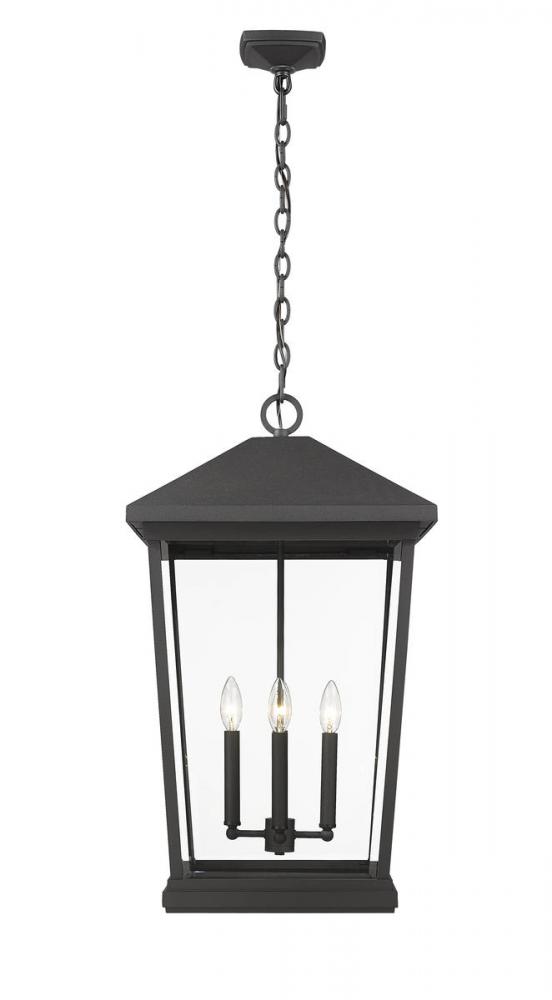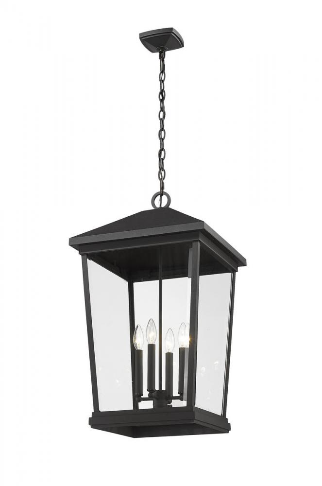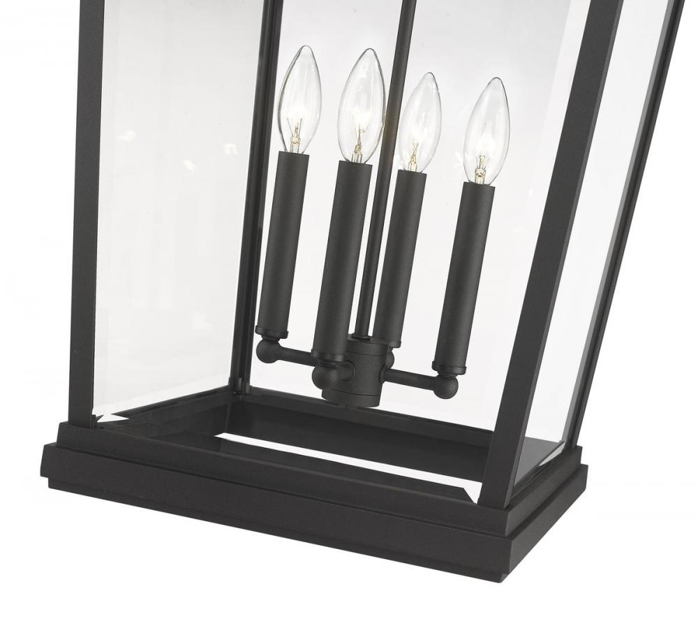 Exterior spaces welcome the charming village-inspired design of this four-light outdoor chain mount ceiling light fixture from the Beacon collection. A tapered rectangular matte black finish aluminum frame invokes a nautical-like housing silhouette with matching candelabra-style bulb mounts and chain, as clear beveled glass panels provide a see-through view. Add soft, romantic style to decks, patios, gazebos, and porches with this ornate light.