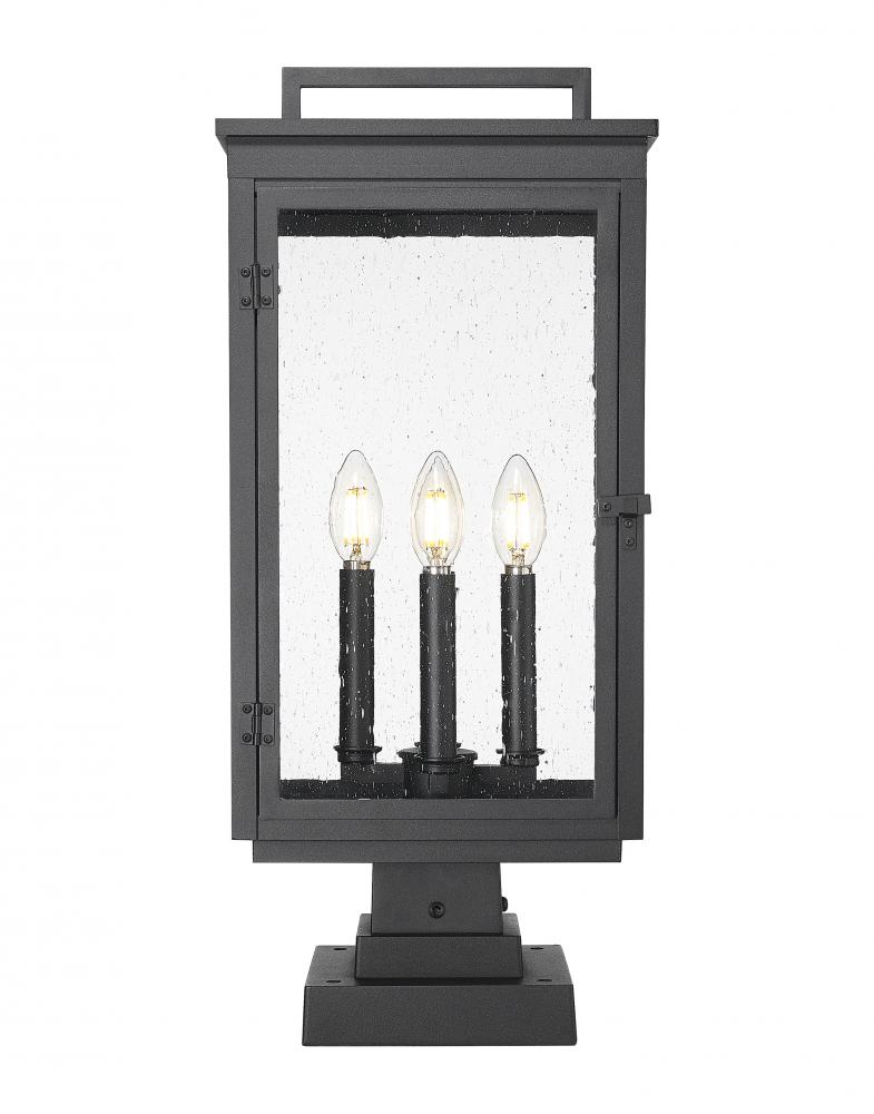 A charming handle detail pairs with clear seedy glass to bring charming flair to this traditional Mission four-light outdoor pier mount fixture. Perfect for curb appeal, it showcases subtle decorative details and candle-style lights that create inviting ambiance in your exterior spaces. A marine-grade sand black finish is a chic, timeless finishing touch.
