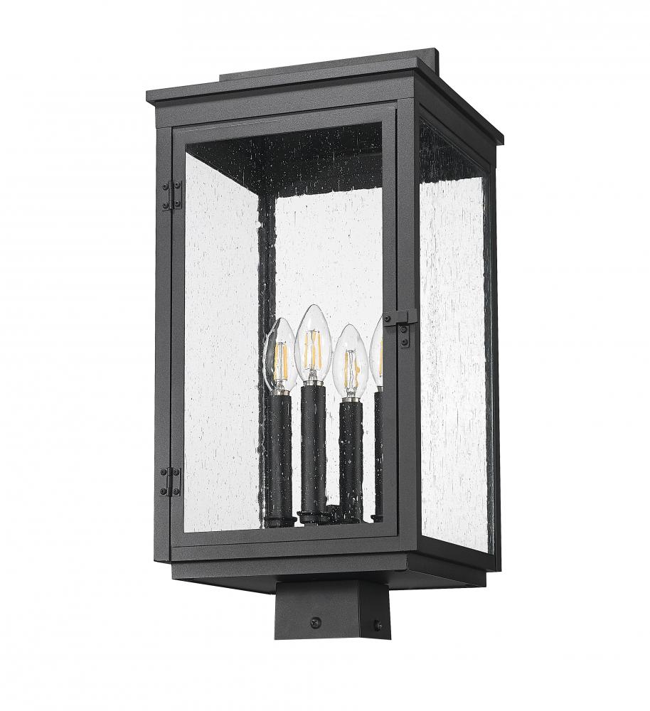 Wrapped in a sand black finish and brimming with character, this four light outdoor post mount fixture turns classic design into a bold statement. Four candle-like lights glow through clear seedy glass, evoking warmth with every flicker. It brings instant presence to pathways, gates, and garden moments.