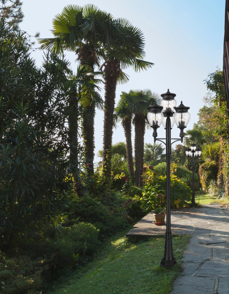 Youll love the vintage character of teardrop glass featured in a charming 16-light outdoor post-mounted fixture. Aluminum construction and a Coastal black finish are durable and stylish, offering versatility to your front walkway or garden path. This charming fixture includes four shades, each with four bulbs within, for a total of 16 lights.