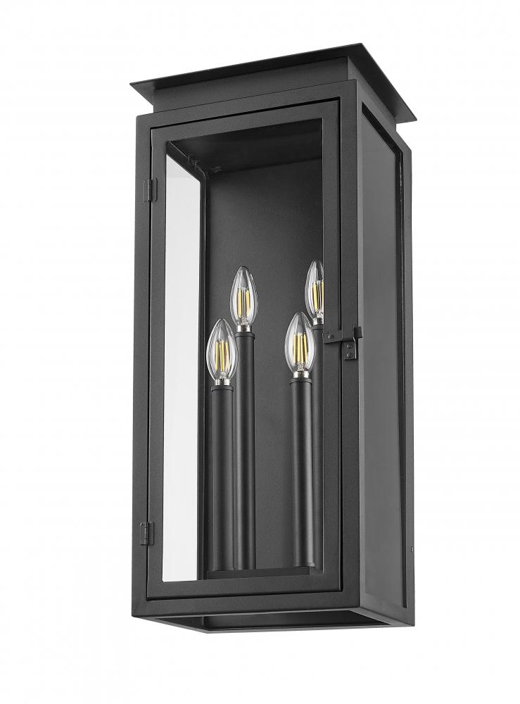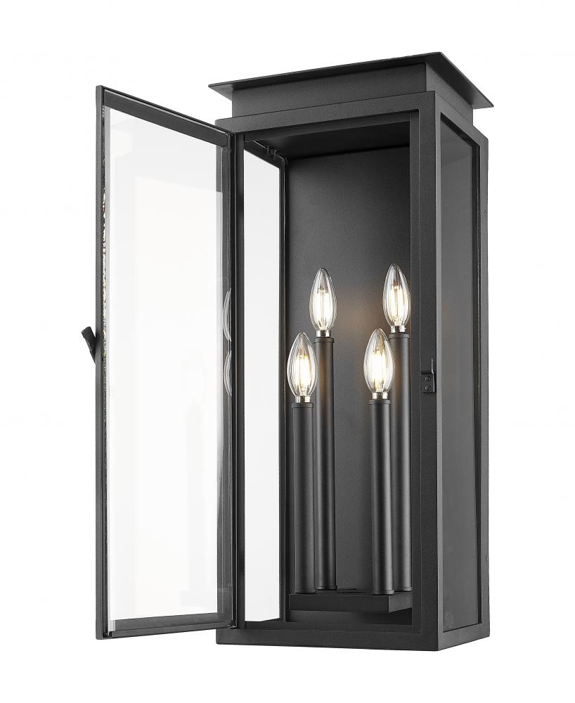 A glass door and stepped trim create subtle style and character for a transitional four-light outdoor wall light. Its lantern silhouette is clean and precise, with bright candelabra lights tucked within. A coastal black finish is crisp and chic, while offering excellent durability against weather.
