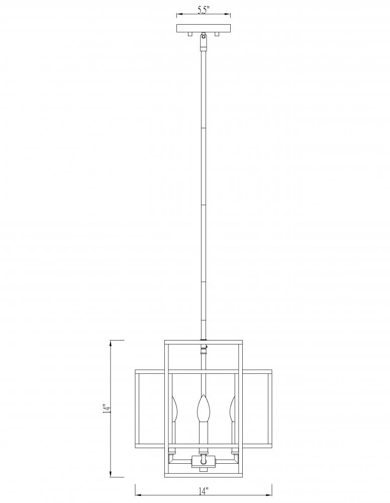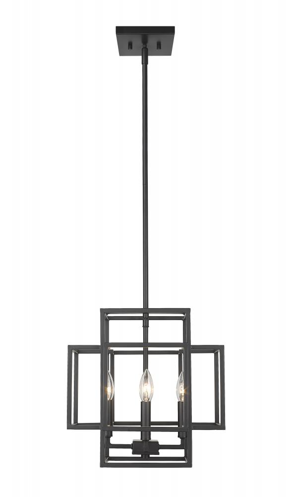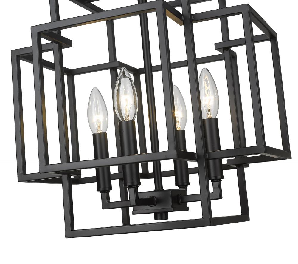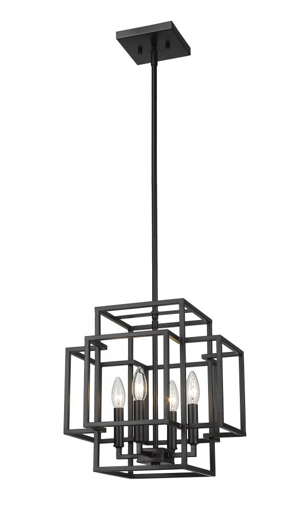 Slim steel outlines this contemporary four-light pendant, creating an eye-catching tesseract-like geometric design that modernizes transitional interior spaces like foyers and kitchen islands. Across the sharply angled steel silhouette is a dramatic matte black finish, enhancing the modern architectural feel and aesthetic. Resting within the open and airy pendant is a candelabra style fixture with four arms holding exposed bulbs for a minimalist industrial effect.