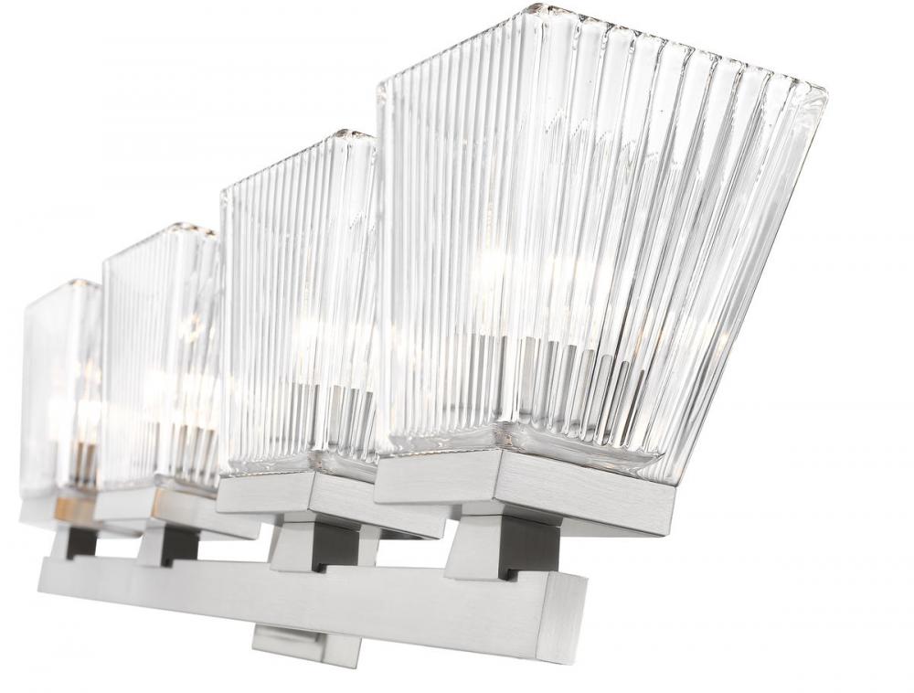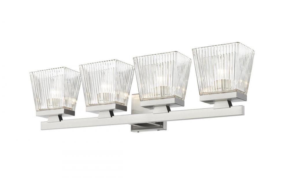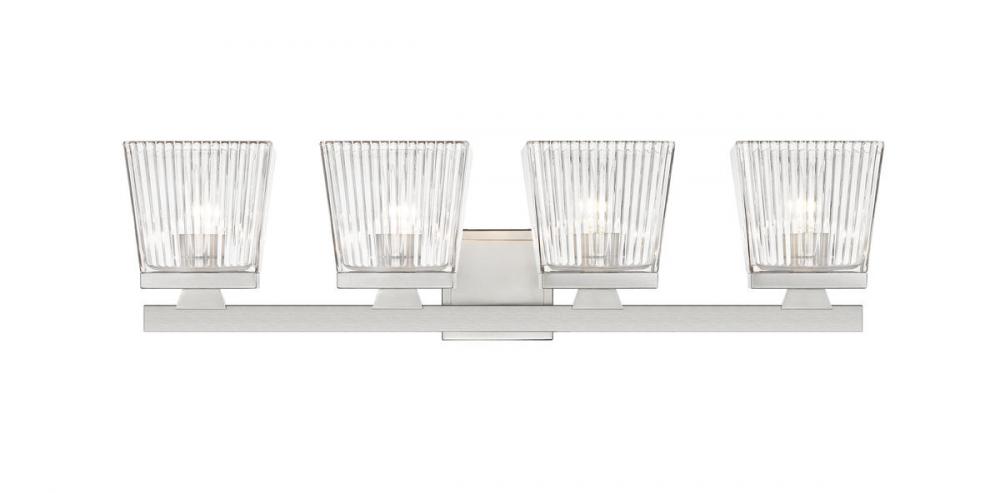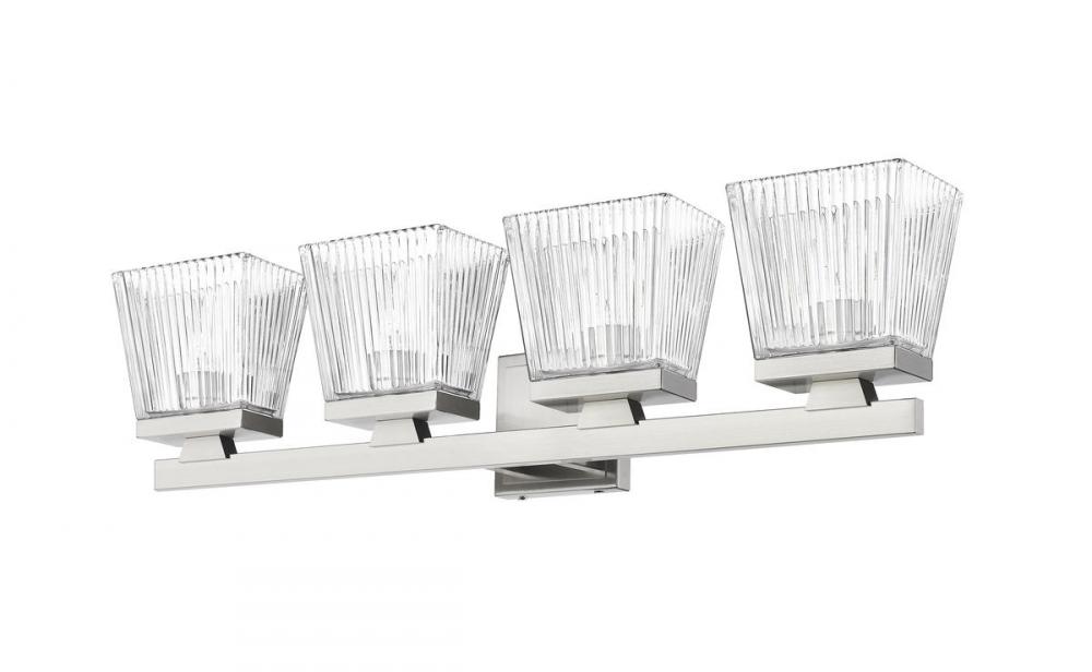 This four-light vanity light in brushed nickel is the perfect piece for your modern farmhouse bathroom or hallway. Clear glass shades with a ribbed texture adds visual interest to the silhouette.