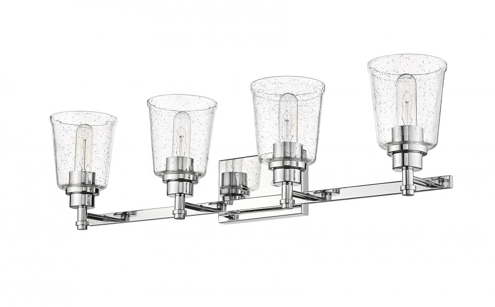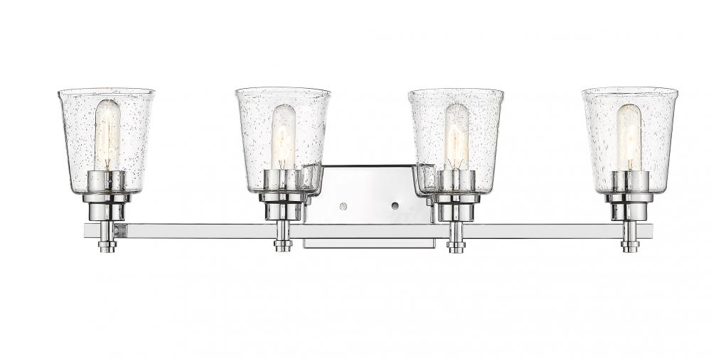Frame a master or guest bath sink with elegance, and add this chrome four-light vanity light to a new or remodeled bath space. Contemporary and transitional, its versatile motif hits on a beautiful blend of durable steel and soft, delicate bell shades fashioned from clear seedy glass.