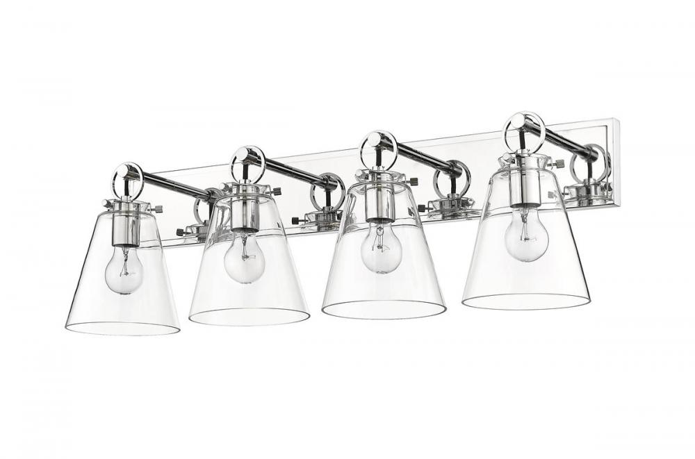 This modern four-light vanity bath light captures a sophisticated aesthetic with nautical inspiration, perfect for an upscale custom bath space. Indulge in delicate conical shades made of clear glass and a shiny chrome finish wall mount updated with charming ring and peg accents. Perfect for a mid-sized to larger vanity, this light becomes a focal point.