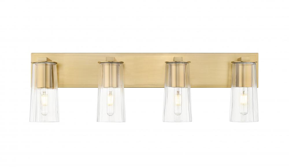 Introduce a hint of warmth with the modern gold finish of a chic four-light vanity fixture. It boasts a bold rectangular wall plate that hosts tapered clear glass shades, each with a tubular bulb for vintage appeal. It delivers crisp, direct illumination, perfect for grooming and beauty tasks and inviting ambiance.