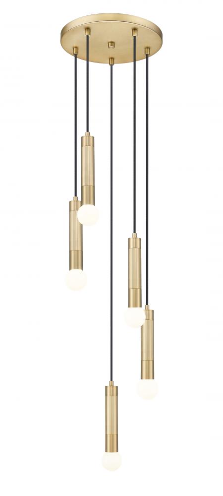Rich and warm, this modern five-light chandelier sets a sophisticated ambiance over your dining table or living room seating group. Varying lengths of braided cords host elongated tubes and petite lights, casting even ambient illumination perfect or daily enjoyment, entertaining and everything in between. Its modern gold finish gleams in the light and offers upgraded presence to surrounding decor.