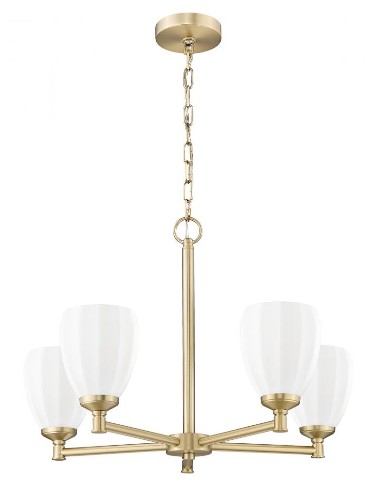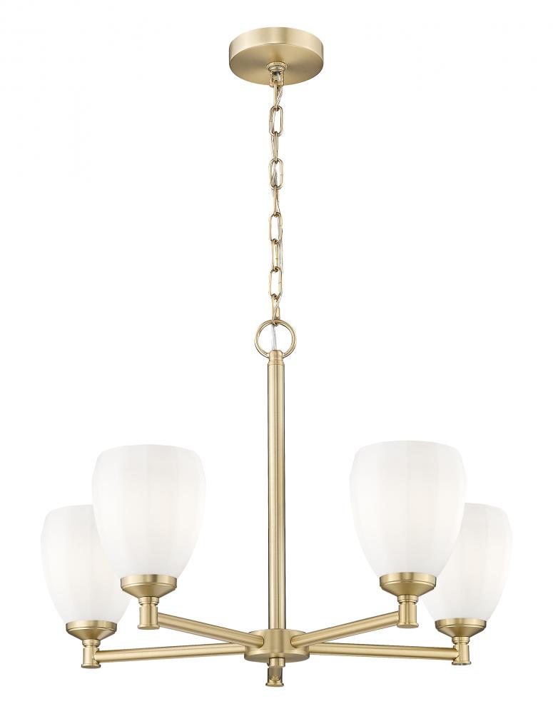 Set a sophisticated ambiance with this modern five-light chandelier as it casts inviting illumination over your entry or dining room. Its a clean-lined profile crafted in steel, complete with a modern gold finish that lends richness and warmth to your home. Each light is enhanced with a lovely opal glass shade with a tapering tulip inspired silhouette with delicate faceting that adds unique flair.