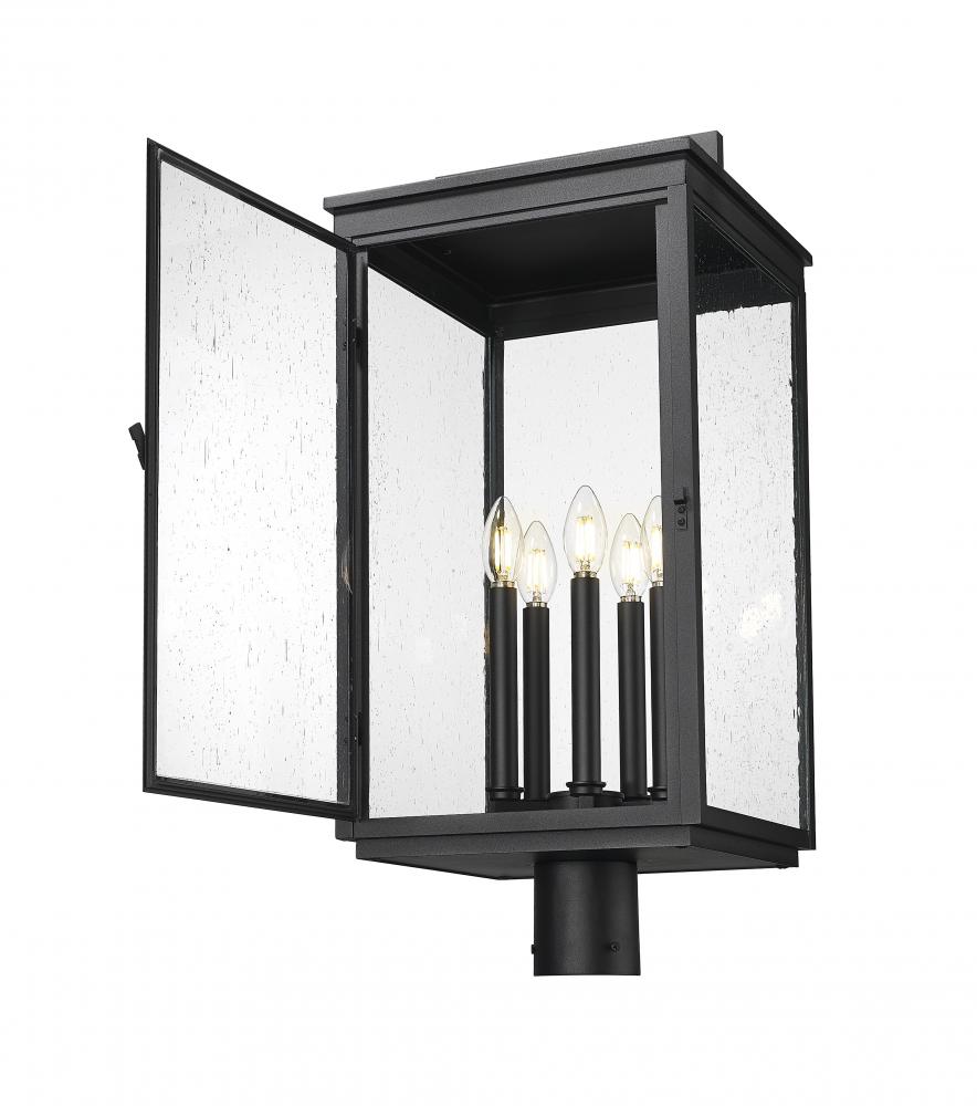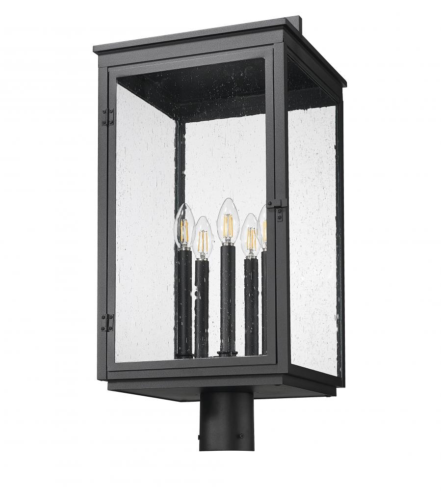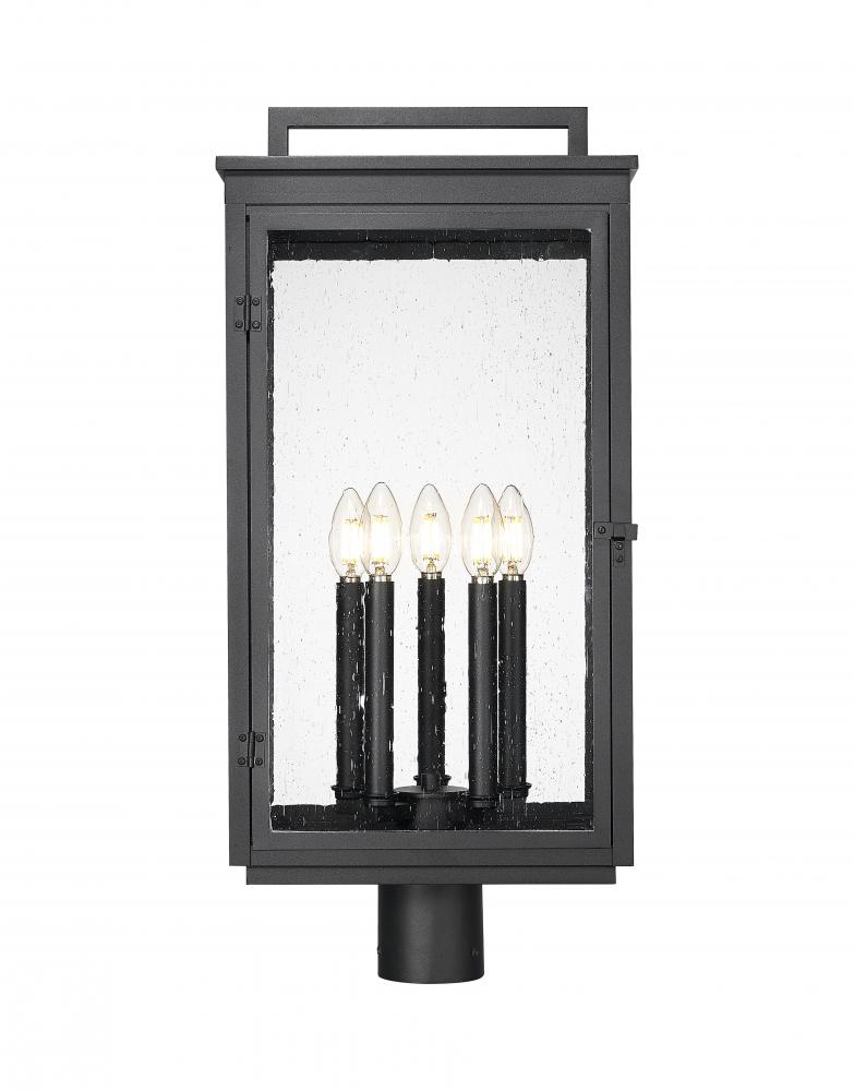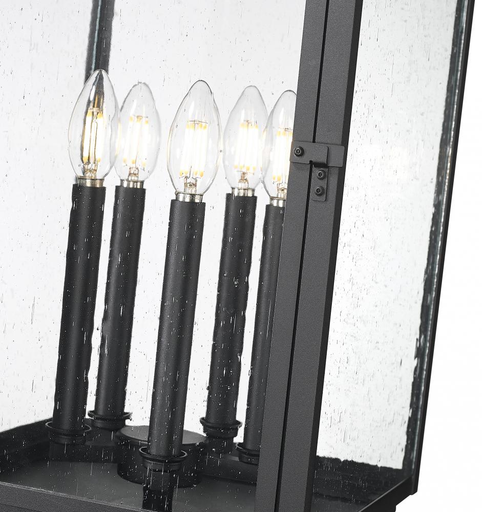 With its sand black finish and signature crown detail, this post mount fixture adds timeless charm to any exterior. Five candle-style lights shine gently behind clear seedy glass, casting a glow that feels as classic as it is inviting. Ideal for walkways or entry posts, it instantly elevates outdoor spaces.