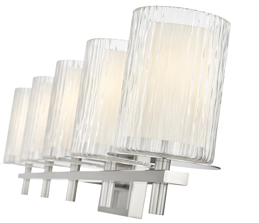 Choose this five-light vanity light to introduce classic artisan inspiration in a contemporary bath space. Intricate detail is textural and artisan with clear glasswork in a cylinder shape, with an inner white diffuser. Etched opal and clear glass blend as they enhance cool brushed nickel finish framing and show off a crisp mix of circles and lines.