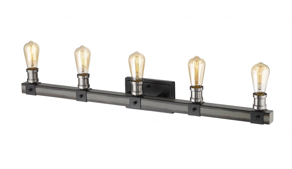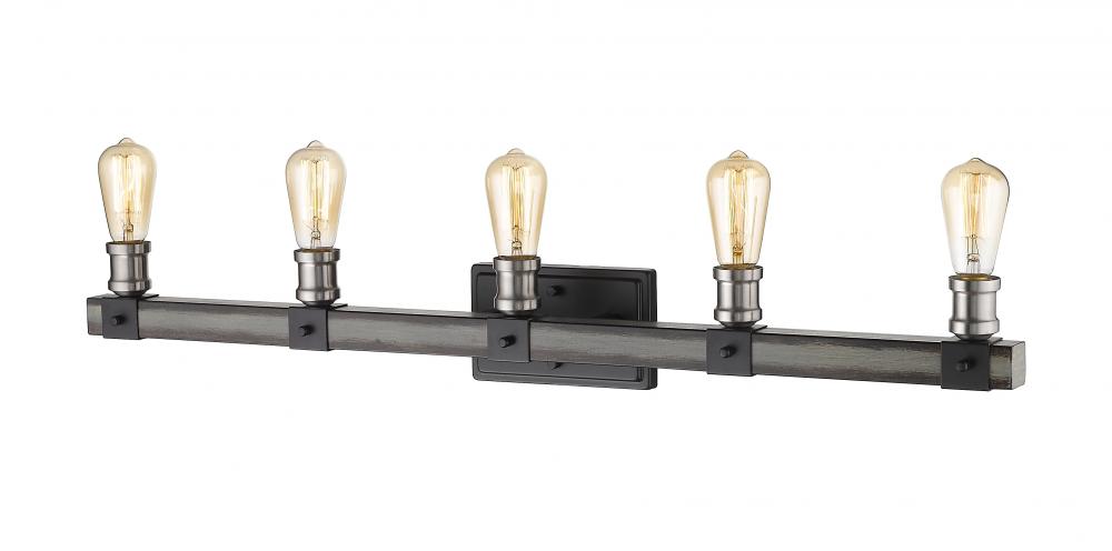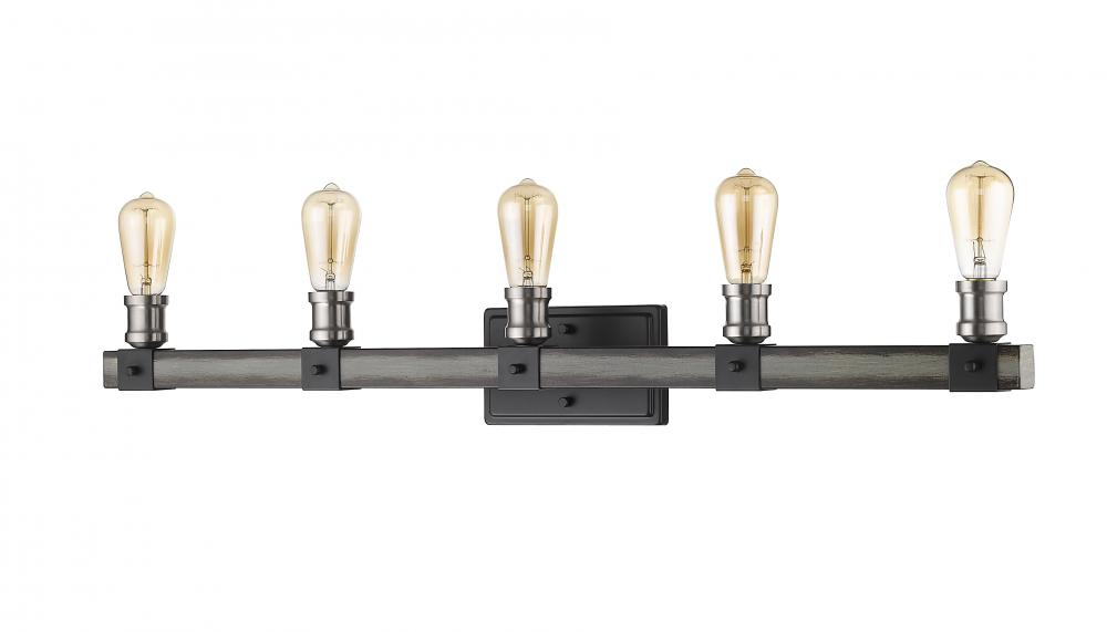 Featuring a sleek silhouette, this five-light wall sconce looks great above any bathroom vanity. The faux barnwood construction showcases an ashen hue, modernized with exposed lightbulbs for an industrial feel.
