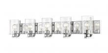 A modern version of nautical charm makes its way into this five-light vanity light from the Beckett collection, adding a pleasing touch to any space. Larger bath areas light up with this vanity light fashioned of olde brass finish steel with a rectangular wall mount and charming accents. Clear seedy glass shades in cylindrical form offer a delicate, natural infusion of romance.