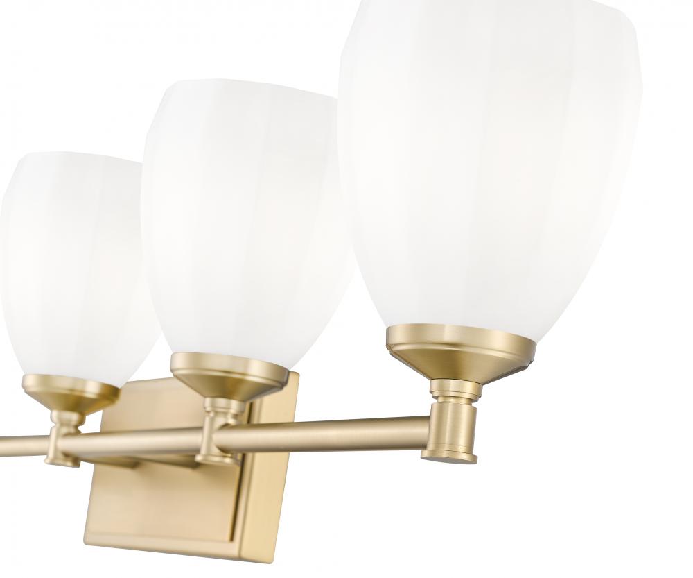 Restoration aesthetics blend with a warm modern gold finish to embellish the clean-lined frame of this five-light vanity bath wall light. Its a rich, inviting design that showcases straight lines and right angles, paired perfectly with tapering, faceted opal glass shades that add unique character and beautiful illumination.