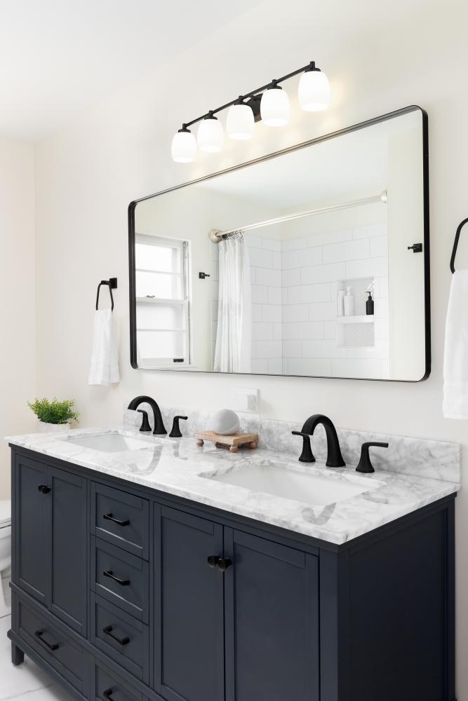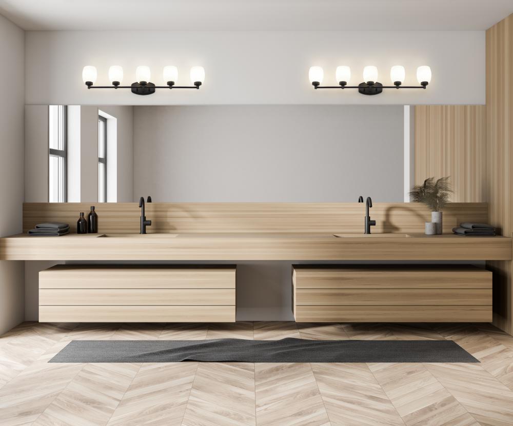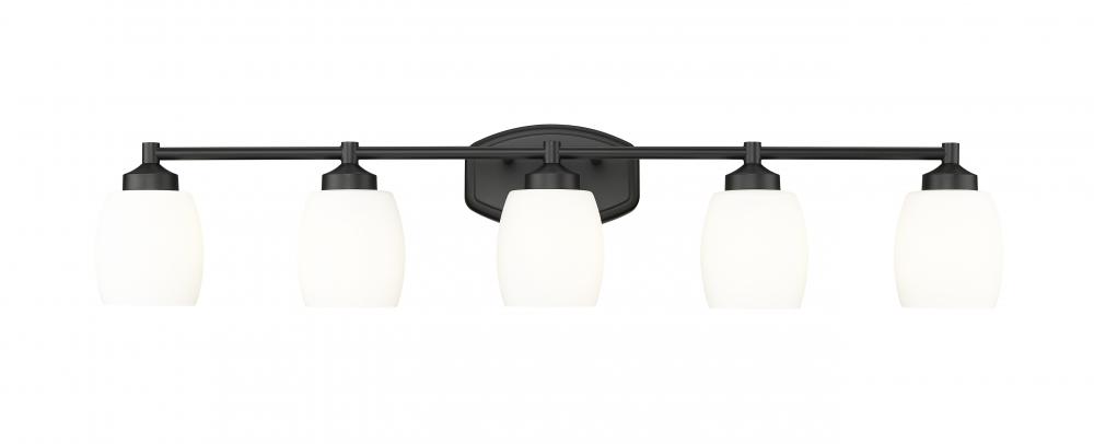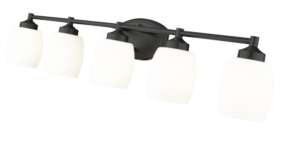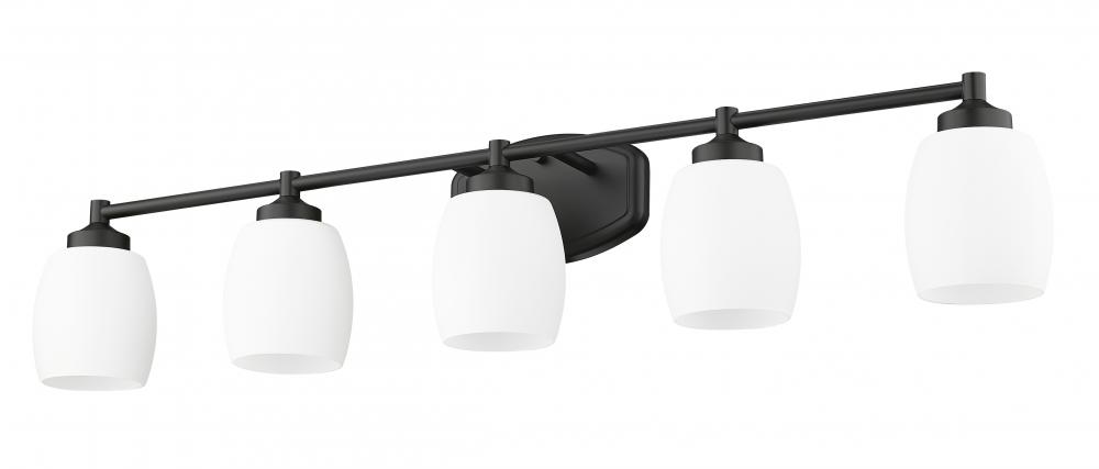 Embrace simplicity with the clean curves and deep matte black finish featured on this modern five-light vanity fixture. Its understated design details are showcased in a rounded wall plate and complementary shades, creating a fresh, refined look and feel. Matte opal glass diffuses light beautifully, creating an inviting ambiance for relaxation and tasks.