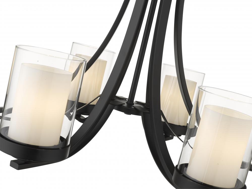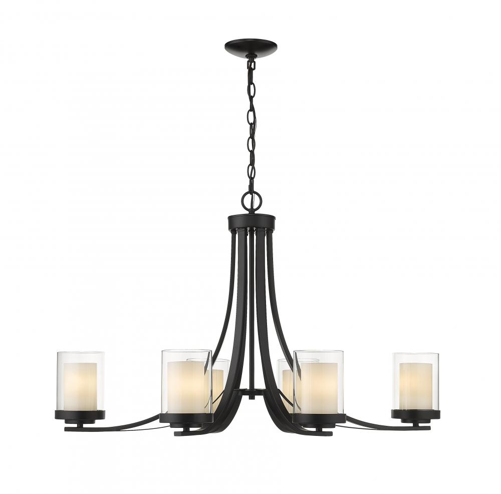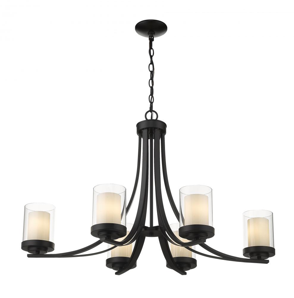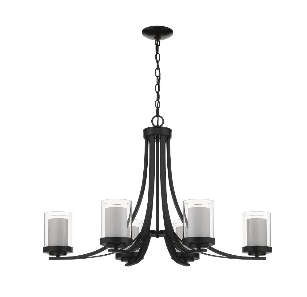 Give your dining room or great room a chic, sophisticated update. This beautiful, matte black chandelier features six glowing bulbs beneath six delicate, glass shades that are matte opal on the inside and clear on the outside. An exquisite lighting option to highlight your refined sense of style.
