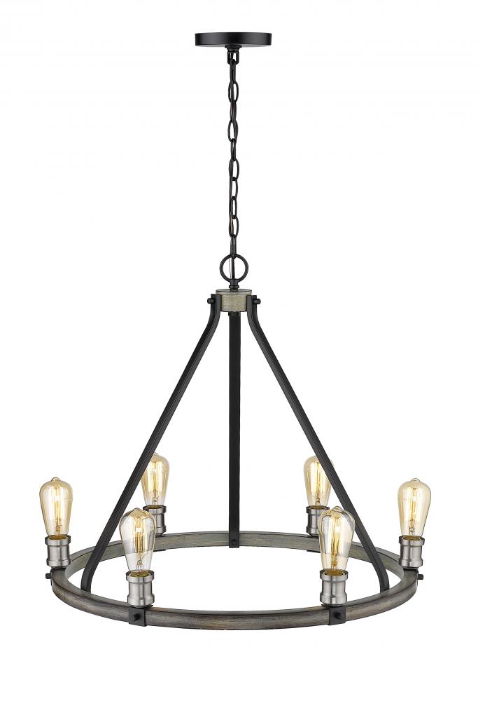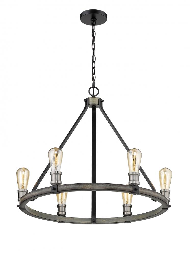 The ring of exposed lightbulbs from this six-light faux barnwood chandelier is perfect for an entryway or large dining room. Celebrate modern industrialism with the distressed ashen finish.