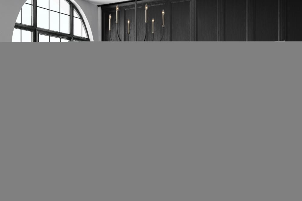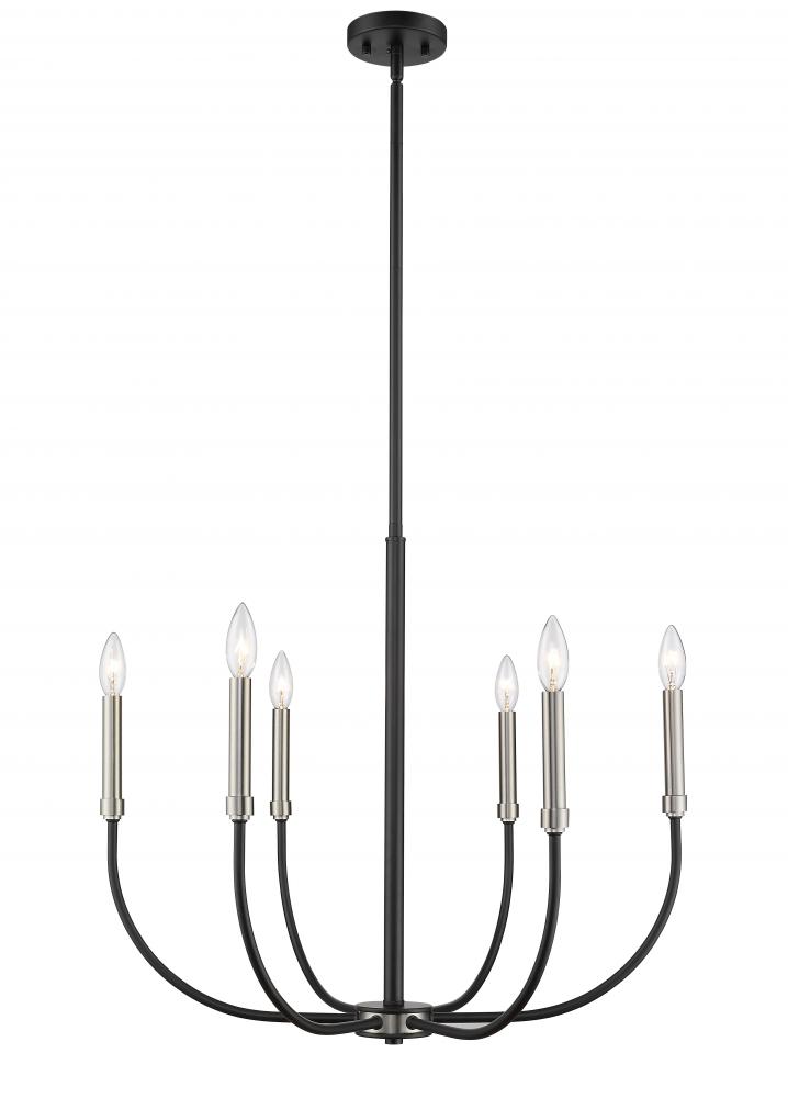 Shapely lines and an alluring shape highlight the design of this two-tone six-light chandelier. It features a candelabra-type design and is crafted in a classic matte black and brushed nickel finish. This delightful chandelier is perfect for the dining room, foyer, kitchen, or entertainment room.