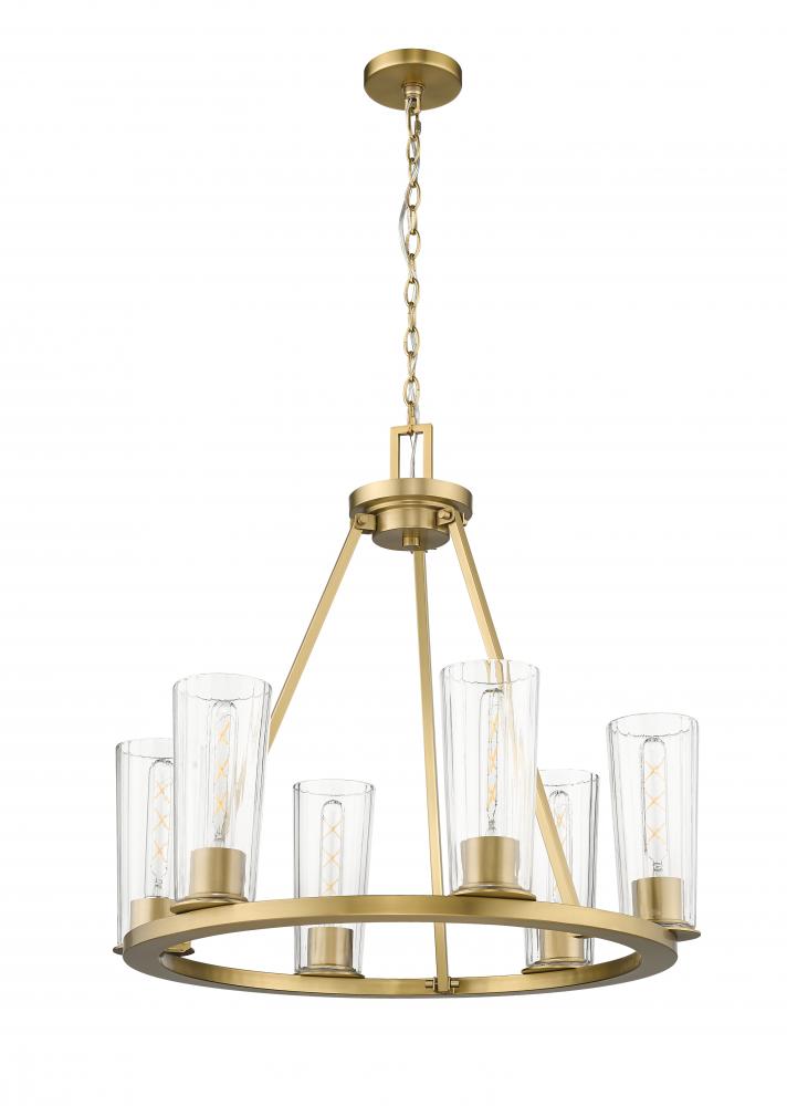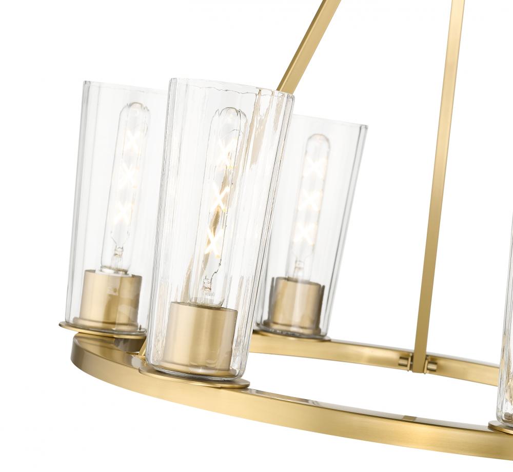 Create inviting warmth with the modern gold finish featured on a fashion-forward six-light ring chandelier. This chandelier is perfect for a breakfast nook or dining table, it boasts a classic silhouette and vintage charm with tubular bulbs. Tapering glass shades are clear and crisp, adding the perfect dose of character.