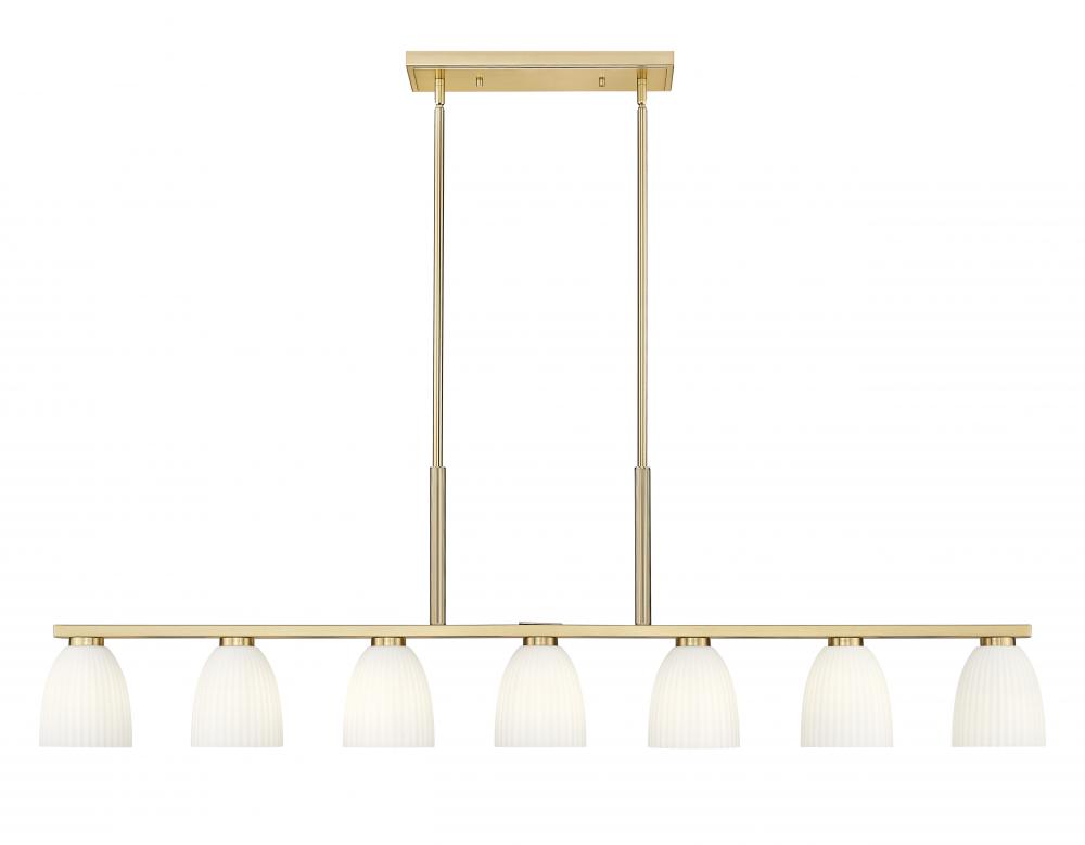 Stunning in silhouette and rich in tone, this seven-light linear chandelier in a modern gold finish brings soft elegance to your space. Ribbed matte opal glass shades lend subtle movement and luminous warmth across wide surfaces. It?s graceful, balanced lighting that lives beautifully above the heart of the home.