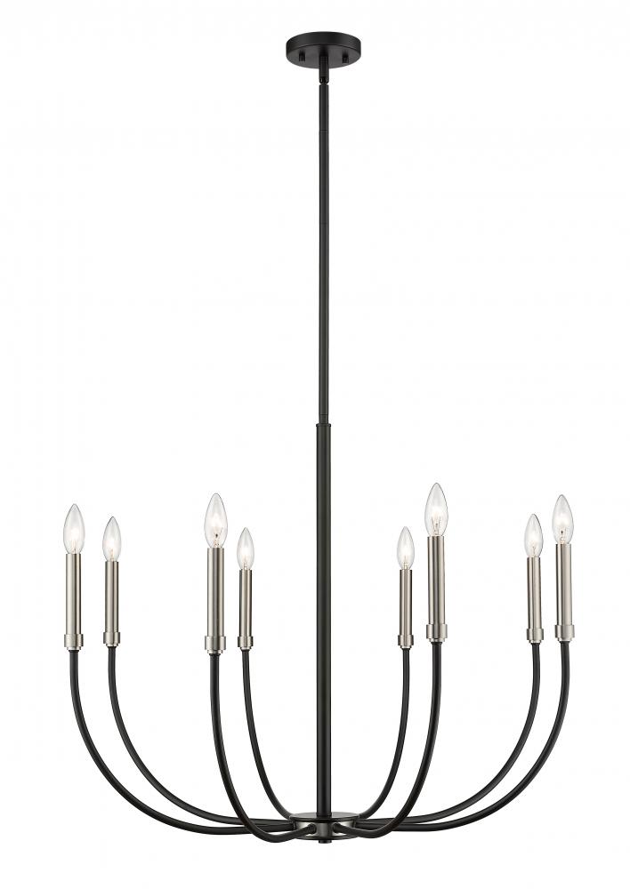 Shapely contours highlight the appeal of this two-tone eight-light chandelier. The candelabra-type design features a classic matte black and brushed nickel finish for an elegant touch. This alluring chandelier will add a discernible charm to any dining room, foyer, kitchen, or entertainment room.